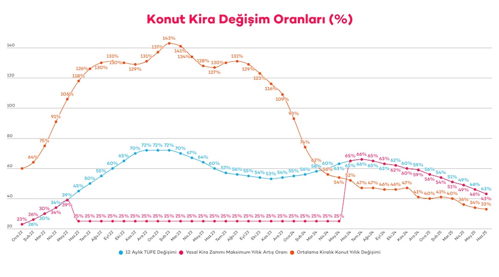 Rapor, kiralık konut piyasasında fiyatların ilk yarıyılda reel olarak yükseldiğini ortaya koydu. Buna göre, kiralık konut fiyatları 2025’in ilk 6 ayında %21,5 arttı. Fiyat değişimleri enflasyondan arındırıldığında, bu dönemde kiraların reel olarak %4,4 arttığı görülüyor. Yıllık bazda bakıldığında, Türkiye genelinde kiralar;