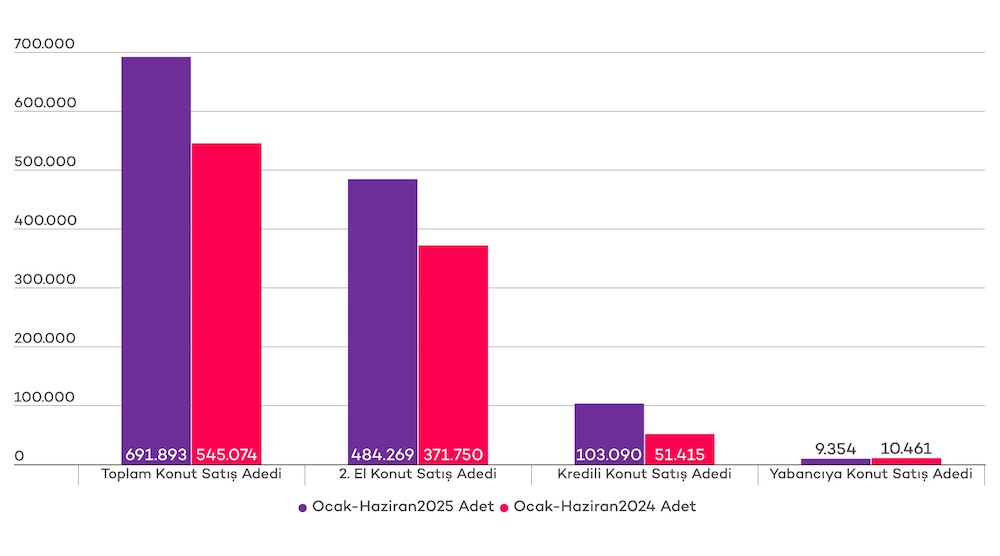 “Konut satışları 2025 yılının ilk 6 ayında geçen senenin aynı dönemine göre %26,9 oranında artış göstererek 691.893 olarak gerçekleşti. 2024 yılı ile 2025 yılı karşılaştırıldığında en önemli farkın ipotekli satışlarda olduğu görülüyor. 2025 yılının ilk 6 ayında ipotekli konut satışları geçen senenin aynı dönemine göre %100,5 oranında artarak 103.090 olarak gerçekleşti. İpotekli konut satışları geçen senenin ilk 6 ayında toplam satışların %9,4’ünü oluştururken, bu yıl %14,9’unu oluşturdu.