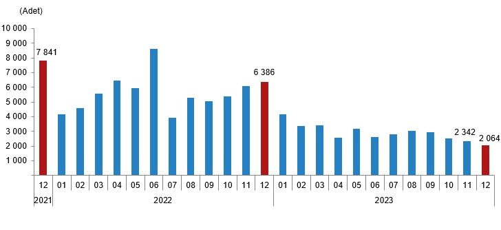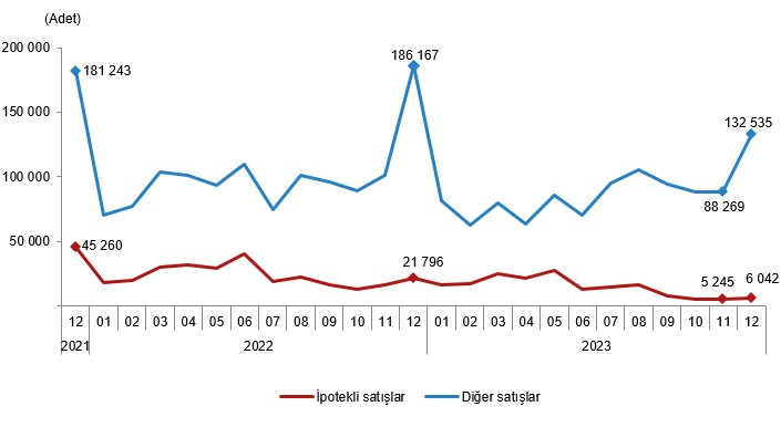 Türkiye İstatistik Kurumu (TÜİK) 2023 yılı Aralık ayı Konut Satışı İstatistiklerine göre, 2023 Aralık konut satışları bir önceki yılın aynı ayına göre yüzde 33,4 azalarak 138 bin 577 oldu. Aynı şekilde Türkiye genelinde 2023 Kasım ayında 93 bin 514 adet konut, 2022 yılı Aralık ayında ise 207 bin 963 konut satılmıştı. Dolayısıyla TÜİK verilerine göre, Aralık ayında konut satışları bir önceki aya göre yüzde 32,5 oranında arttı.