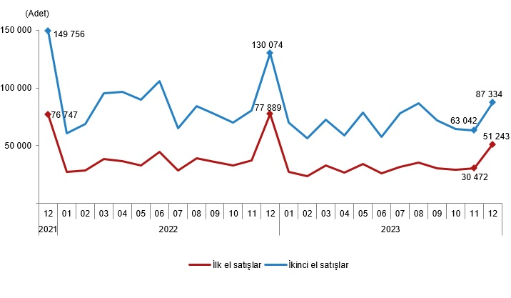 Türkiye genelinde ikinci el konut satışları 2023 Aralık ayında bir önceki yılın aynı ayına göre yüzde 32,9 azalarak, 87 bin 334 oldu. Böylece toplam konut satışları içinde ikinci el konut satışının payı yüzde 63 oldu.