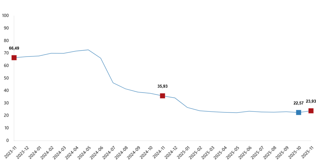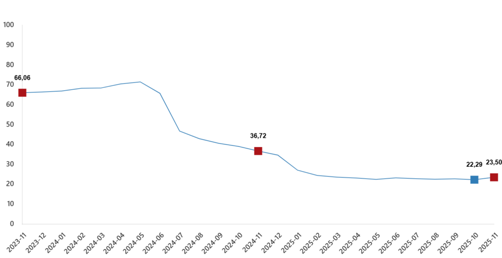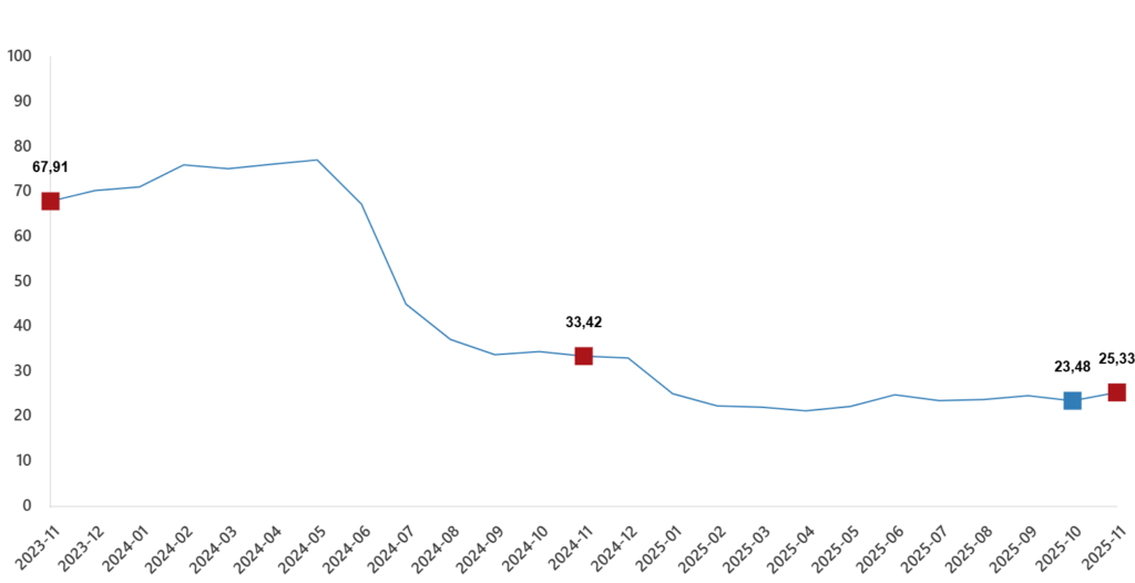 TÜİK verilerine göre 2025 Kasım ayı inşaat maliyet endeksi, 2025 Ekim ayına göre yüzde 1,14 artış gösterdi. Bunun yanında yıllık bazda İME artışı bir önceki yılın aynı ayına göre ise yüzde 23,93 oldu.