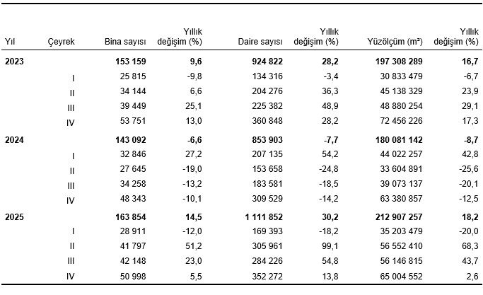 TÜİK 2025 Yılı Üçüncü Çeyrek Yapı İzin İstatistikleri verilerine göre, yılın dördüncü 3 ayında Yapı Ruhsatı verilen bina sayısı yüzde 5,5 arttı. Öte yandan 2025 Yılı Üçüncü Çeyrek Yapı İzin İstatistikleri verilerine göre, Temmuz-Eylül 2025 arası Yapı Ruhsatı verilen yapıların bina sayısı yüzde 47,4 artmıştı. Zira yapı ruhsatı verilen bina sayısında azalma söz konusudur. Ancak öte yandan daire sayısı bariz bir şekilde artmakta ve yüzölçümü aynı oranda artmamaktadır. Buradan hareketle daire metrekare alanlarının sosyo-ekonomik imkanlara da bağlı olarak azaldığını söyleyebiliriz.