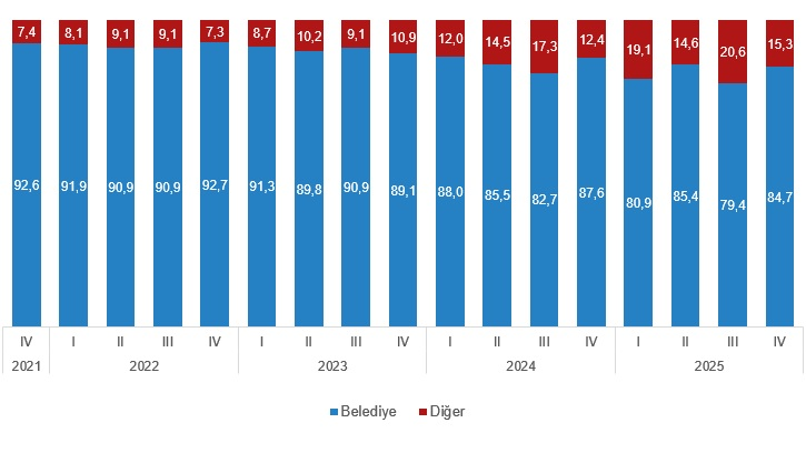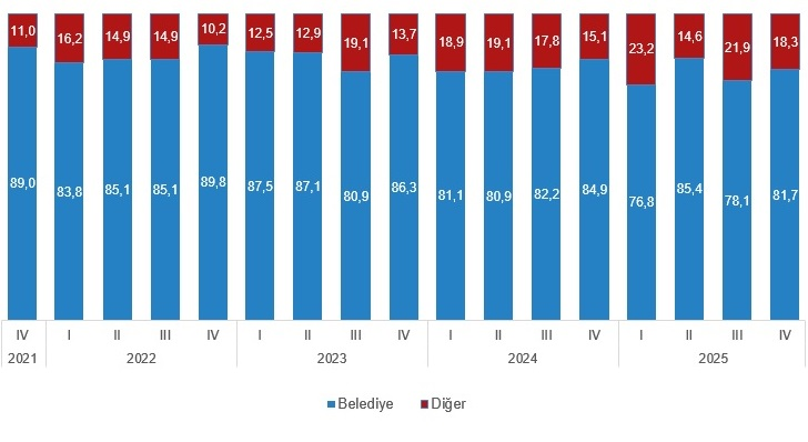 Belediyeler tarafından verilen yapı kullanma izin belgeleri (YKİB)’nin 2025 yılının dördüncü çeyreğinde bir önceki yıla göre;
