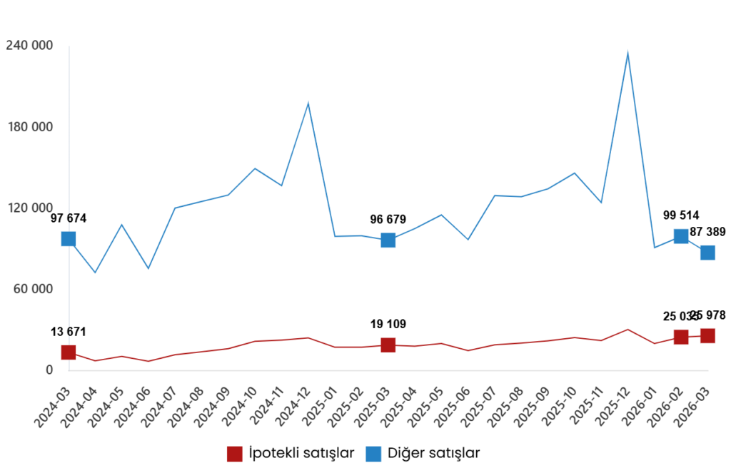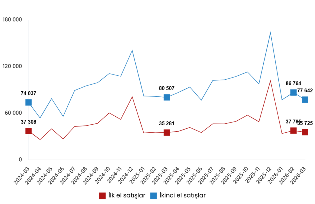 TÜİK konut satış rakamlarına baktığımızda görüyoruz ki, ülkemizde son dönemde konut satışları dalgalı bir seyir izlemekte. Nitekim 2026 Mart konut satışları bir önceki yılın aynı ayına göre yüzde 2,1 azalarak 113 bin 367 oldu. Bu yılın üçüncü ayındaki konut satışlarında dikkat çeken husus ise; diğer satışların payının %77,1 olarak gerçekleşmiş olmasıdır.