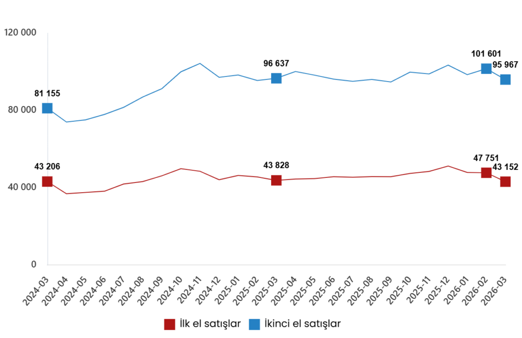 Türkiye İstatistik Kurumu (TÜİK) 2026 Mart Konut ve İş Yeri Satışı İstatistiklerine göre, 2026 Mart konut satışları bir önceki yılın aynı ayına göre yüzde 2,1 düşerek 113 bin 367 oldu. Aynı şekilde Türkiye genelinde 2026 Şubat ayında 124 bin 549 adet konut, 2025 yılı Mart ayında ise 110 bin 795 konut satılmıştı. Dolayısıyla TÜİK verilerine göre, mart ayında konut satışları bir önceki aya göre yüzde 9 azalmıştır.