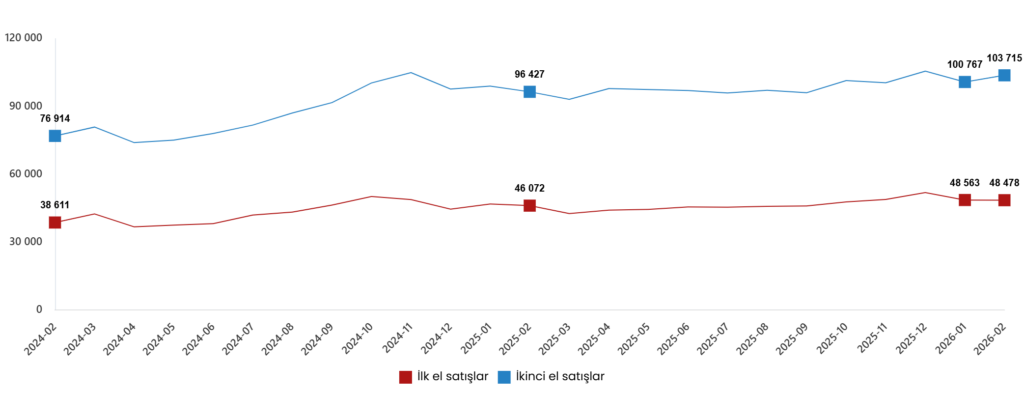 TÜİK konut satış rakamlarına baktığımızda görüyoruz ki, ülkemizde son dönemde konut satışları dalgalı bir seyir izlemekte. Nitekim 2026 Şubat konut satışları bir önceki yılın aynı ayına göre yüzde 5,9 artarak 124 bin 549 oldu. Bu yılın ikinci ayındaki konut satışlarında dikkat çeken husus ise; ikinci el konut satışlarının toplam konut satışları içinde payı %69,7 oldu.