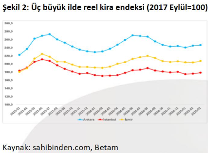 Nitekim Türkiye genelinde ve üç büyükşehirde şubattan marta cari kira fiyatlarındaki artışın aylık enflasyondan daha yüksek olması sonucu enflasyondan arındırılmış (reel) kira fiyatları yükselmiştir.