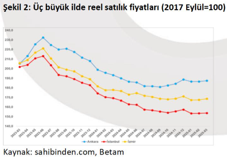 Ülke genelinde olduğu gibi üç büyük ilde de reel satılık konut endeksinde yaklaşık bir yıldır devam eden düşüş 2024’ün son aylarında durmuş ve reel satılık konut endeksinde artış gözlenmişti. Şubat ayında konut reel satılık fiyat endeksi paralel olarak seyretti. Şubattan marta reel konut fiyat endeksi;