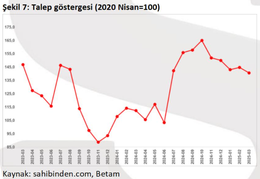 Talep endeksi Şubat 2023 depreminin ardından düşüş yönlü bir seyir izleyerek Kasım 2023’te 88,7’ye kadar gerilemişti. Aralık 2023’ten itibaren yönünü yukarı çeviren endeks Kasım 2024’te tekrar düşüşe geçmiştir. Mart 2025’te de bu düşüş devam etmiştir. Marttan şubata yüzde 2,8’lik bir düşüşle 140,7 seviyesine gelmiştir. Geçen yılın mart ayına kıyasla endeks yüzde 25,2 daha yüksektir.