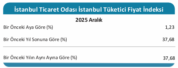 İTO tarafından, İstanbul Tüketici Fiyat İndeksi 2025 Aralık Basın Bülteni yayınlandı. Nitekim aralıkta İstanbul Tüketici Fiyat İndeksi yıllık artışı %37,68 olarak gerçekleşmiştir.