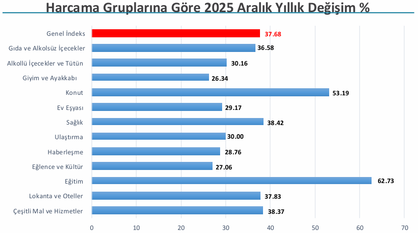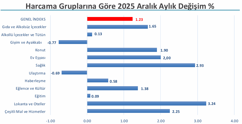 - 2025 Aralık ayında en yüksek grup artışı Lokanta ve Oteller harcama grubunda (% 3,24), en yüksek grup azalışı ise Giyim ve Ayakkabı Harcamaları grubunda (-0,77) izlenmiştir.