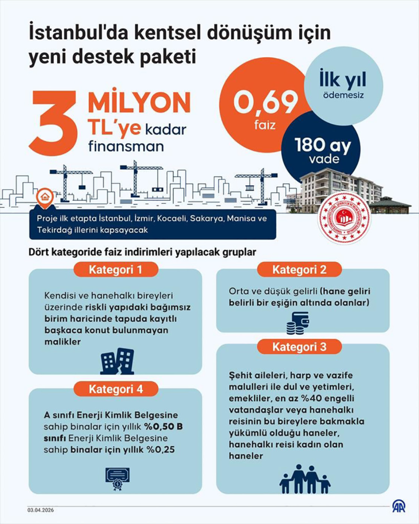 Öte yandan, Çevre, Şehircilik ve İklim Değişikliği Bakanlığından yapılan açıklamaya göre, kentsel dönüşümle ev ve iş yerlerini yenilemek isteyen İstanbullular, Bakanlık koordinasyonunda, Dünya Bankası finansmanıyla yürütülen “İklim ve Afetlere Dayanıklı Şehirler Projesi” İADŞP kapsamında 3 milyon liraya varan kentsel dönüşüm kredisinden faydalanabilecek.