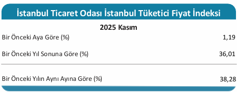 İstanbul Ticaret Odası (İTO), İstanbul Tüketici Fiyat İndeksi 2025 Kasım Basın Bültenini yayınladı. Nitekim İTO İstanbul Tüketici Fiyat İndeksi yıllık artışı %38,28 olarak gerçekleşmiştir.