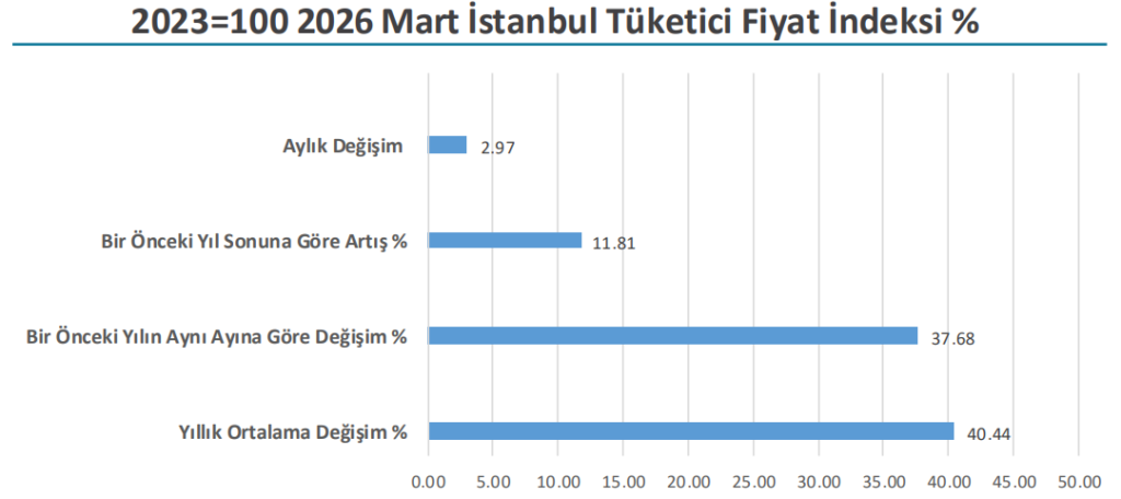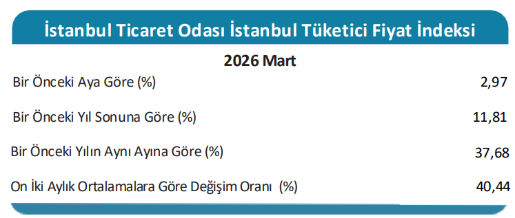 İstanbul Ticaret Odası (İTO), İstanbul Tüketici Fiyat İndeksi 2026 Mart Basın Bültenini yayınladı. Nitekim İTO İstanbul Tüketici Fiyat İndeksi yıllık artışı %37,68 olarak gerçekleşmiştir.