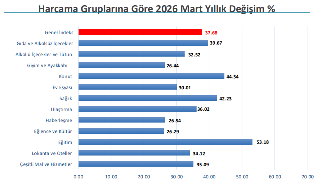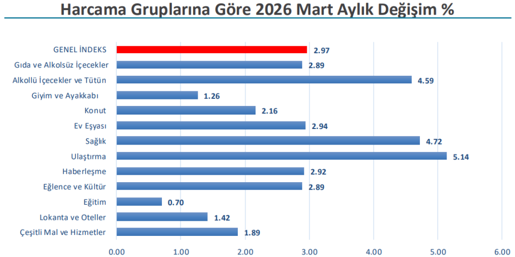 o 2026 Mart ayında en yüksek grup artışı Ulaştırma harcamaları grubunda (% 5,14), en düşük grup artışı ise
