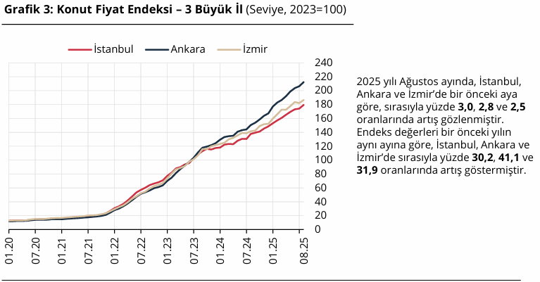 Türkiye’nin en büyük şehirlerinden İstanbul, Ankara ve İzmir’de konut fiyatlarında artış gözlemlenmiştir. Nitekim KFE 2025 yılı Ağustos ayında bir önceki aya göre;