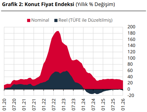 Türkiye Cumhuriyet Merkez Bankası (TCMB), Türkiye konut piyasasındaki fiyatların değişimlerinin takip edilmesi amacıyla oluşturulan Konut Fiyat Endeksi (KFE) verilerini açıkladı. Nitekim 2026 Ocak Konut Fiyat Endeksi (KFE) verilerine göre Türkiye genelinde Konut Fiyat Endeksi Ocak ayında bir önceki aya göre yüzde 3,7 oranında arttı. Aynı şekilde KFE bir önceki yılın aynı ayına göre nominal olarak yüzde 27,7 oranında artmış. Ancak reel olarak ise yüzde 2,3 oranında azalmıştır.