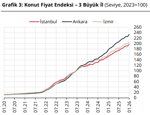 Türkiye’nin en büyük şehirlerinden İstanbul, Ankara ve İzmir’de konut fiyatlarında artış gözlemlenmiştir. Nitekim KFE 2026 yılı Ocak ayında bir önceki aya göre;