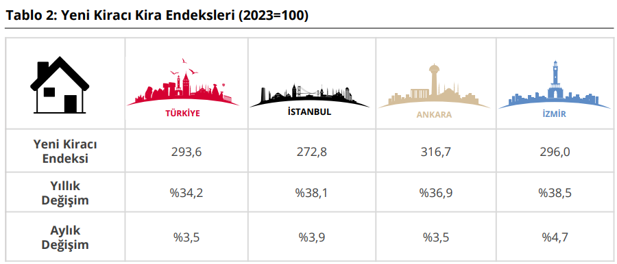 TCMB 2026 Ocak Yeni Kiracı Kira Endeksi verilerine göre Türkiye genelinde Ocak ayında YKKE, bir önceki yılın aynı ayına göre nominal olarak yüzde 34,2 arttı.