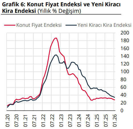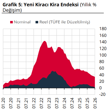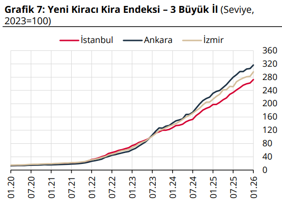 Türkiye Cumhuriyet Merkez Bankası (TCMB), Türkiye konut piyasasındaki fiyatların değişimlerinin takip edilmesi amacıyla oluşturulan Konut Fiyat Endeksi (KFE) verilerini açıkladı. Nitekim 2026 Ocak Yeni Kiracı Kira Endeksi (YKKE) verilerine göre Türkiye genelinde Kira Endeksi Ocak ayında bir önceki aya göre yüzde 3,5 oranında arttı. Aynı şekilde YKKE bir önceki yılın aynı ayına göre nominal olarak yüzde 34,2 oranında artmıştır. Ancak reel olarak ise yüzde 2,7 oranında artmıştır.