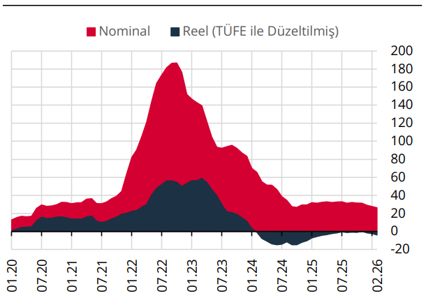 2026 yılı Şubat itibariyle açıklanan KFE değerleri, bir önceki yılın aynı ayına göre nominal olarak yüzde 26,4 oranında artış göstermiştir. Ancak KFE reel olarak yüzde 3,9 oranında düşüş gözlemlenmiştir.
