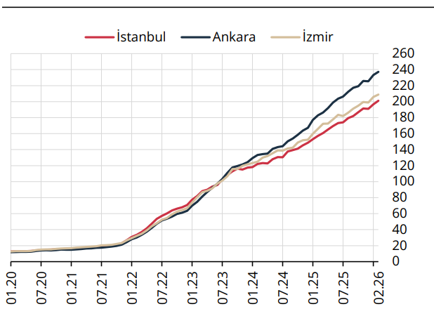 Türkiye’nin en büyük şehirlerinden İstanbul, Ankara ve İzmir’de konut fiyatlarında artış gözlemlenmiştir. Nitekim KFE 2026 yılı Şubat ayında bir önceki aya göre;