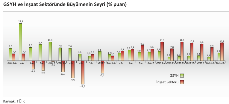 Türkiye ekonomisi 2025 yılı ikinci çeyreğinde çeyreklik bazda %1,6, yıllık bazda %4,8 oranında büyümüştür. İnşaat sektörü %10,9 ile yılın ikinci çeyreğinde genel ekonominin önünde bir büyüme gerçekleştirmiştir.