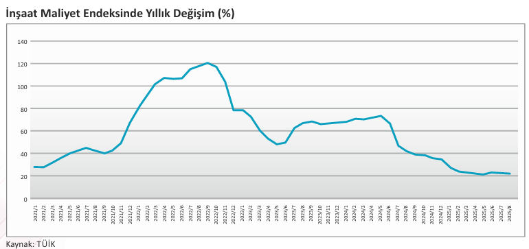 TÜİK tarafından açıklanan İnşaat Maliyet Endeksi Ağustos verilerine göre malzeme ve işçilik maliyetlerindeki artış yatay seyrini sürdürmüştür. Endeks, Ağustos ayında aylık bazda %1,05, yıllık bazda ise %22,82 oranında artmıştır. İnşaat Maliyet Endeksi kapsamındaki malzeme endeksi Ağustos’ta aylık bazda %1,46 ve yıllık bazda %19,17 artarken; işçilik endeksi aylık bazda %0,28, yıllık bazda ise %30,16 yükselmiştir.