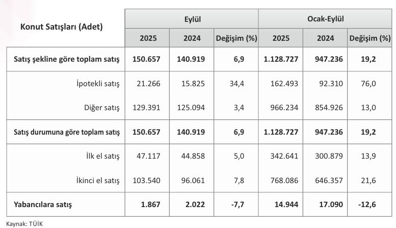 Türkiye genelinde konut satışları 2025 yılı Eylül ayında bir önceki yılın aynı ayına göre %6,9 oranında