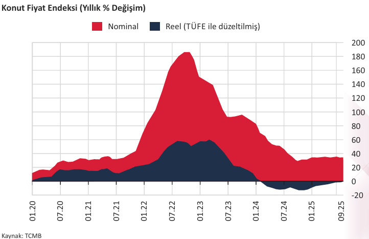 TCMB tarafından Türkiye’deki konutların kalite etkisinden arındırılmış fiyat değişimlerini izlemek amacıyla hesaplanan Konut Fiyat Endeksi (KFE) (2023=100), 2025 yılı Eylül ayında KFE bir önceki aya göre %1,7 oranında artarak 195,7 seviyesinde gerçekleşmiştir. Bir önceki yılın aynı ayına göre nominal olarak %32,2 oranında artan KFE, aynı dönemde reel olarak %0,8 oranında azalarak reel kaybını sürdürmüştür.