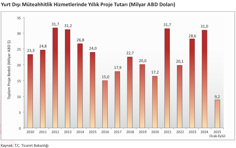 Yurt Dışı Müteahhitlik Hizmetleri (YDMH) kapsamında Ocak-Eylül 2025 dönemi itibarıyla Türk inşaat firmaları tarafından yurt dışında 9,2 milyar ABD Doları tutarında 128 proje üstlenilmiştir.