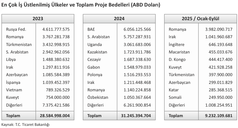 2025 yılının ilk dokuz ayında yurt dışında en çok iş üstlenilmiş ülke 4 milyar ABD Doları ile Romanya
