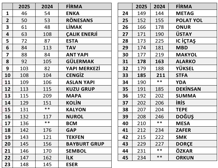 Bültende, müteahhitlik firmaları için zorlukların giderek arttığına dikkat çekilirken, bölgesel çatışmaların tedarik zincirlerinde aksamalara ve maliyetlerde dalgalanmalara yol açtığını, bunun da bazı küresel pazarlarda kârı ciddi ölçüde düşürdüğüne vurgu yapılmıştır. Listede Türk firmalarının yükselişi de dikkat çekmiştir. İlk 50 firma arasında 2 Türk firması, ilk 100 firma arasında ise 8 Türk firması yer alırken, enerji alt sektörü listesinde bir Türk firması da ilk 10’a girmeyi başarmıştır.