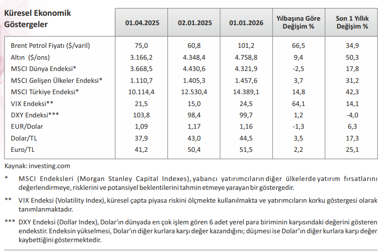 Genel çerçevede 2026 yılına girilirken oluşan görünüm, 2025’teki “görece dengeli” piyasa yapısının yerini daha kırılgan bir konjonktüre bıraktığını ortaya koymuştur. Jeopolitik risklerin enerji ve emtia fiyatları üzerinden enflasyonist baskıları yeniden canlandırması, merkez bankalarının politika alanını daraltmış; bu durum riskli varlıklar üzerinde baskı yaratmıştır.