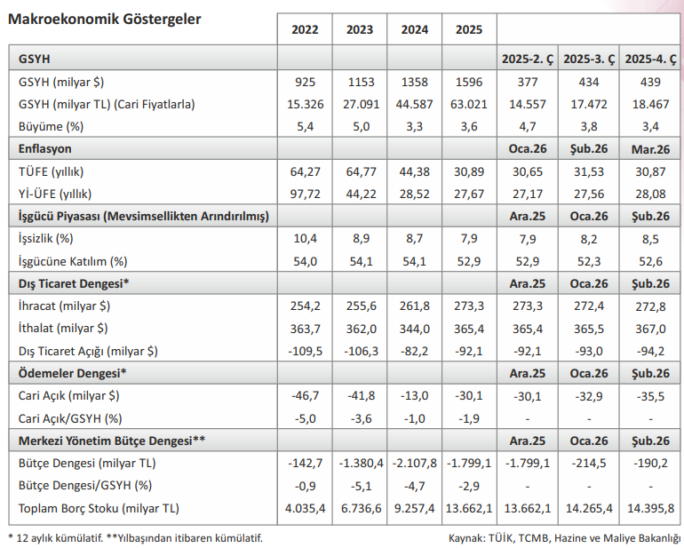 Genel olarak değerlendirildiğinde, 2026 yılının ilk çeyreğinde Türkiye ekonomisi kontrollü bir yavaşlama sürecine girerken, para politikasında temkinli bir gevşeme sürecinin başladığı görülmüştür. Buna karşın yüksek enflasyon, dış finansman ihtiyacı ve jeopolitik riskler ekonomik görünüm üzerindeki kırılganlıkların devam ettiğine işaret etmiştir. Bu çerçevede ekonomi, güçlü bir toparlanmadan ziyade dengelenmenin ön planda olduğu bir geçiş döneminden geçmektedir.