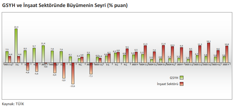 2025 yılında Gayrisafi Yurt İçi Hasıla (GSYH) bir önceki yıla göre %3,6 oranında artarken, inşaat sektörü %10,8 büyüme kaydetmiştir. Aynı dönemde %2,7 büyüyen gayrimenkul faaliyetleri zayıf performansını