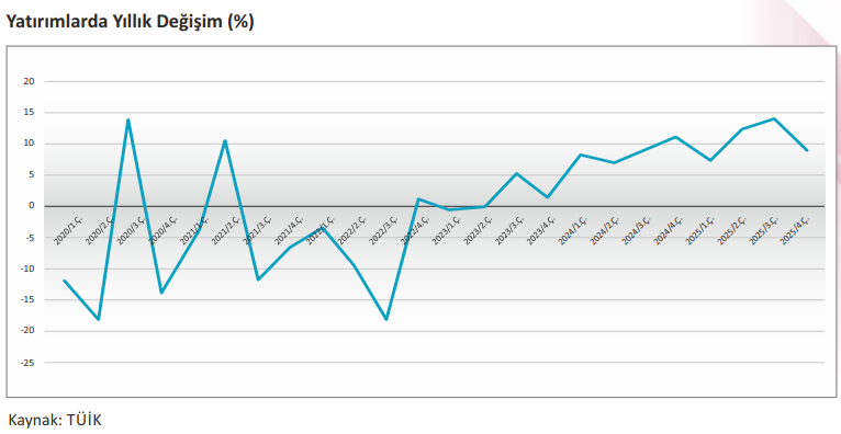 Yatırım harcamaları son çeyrekte %5,4 artış kaydetmiş, ancak önceki çeyreklerdeki güçlü performansına kıyasla ivme kaybederek büyümeye 1,4 puan katkı sağlamıştır. Deprem bölgesindeki yeniden inşa faaliyetlerinin etkisiyle inşaat yatırımları destekleyici olmaya devam ederken, genel yatırım iştahında görece bir yavaşlama gözlenmiştir.