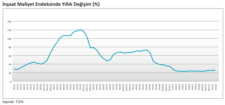 TÜİK tarafından açıklanan İnşaat Maliyet Endeksi Şubat ayında aylık bazda %1,51, yıllık bazda ise %25,72 oranında artmıştır. İnşaat Maliyet Endeksi kapsamındaki malzeme endeksi Şubat’ta aylık bazda %2,33 ve yıllık bazda %23,73 artarken; işçilik endeksi aylık bazda %0,20, yıllık bazda ise %29,12 yükselmiştir.