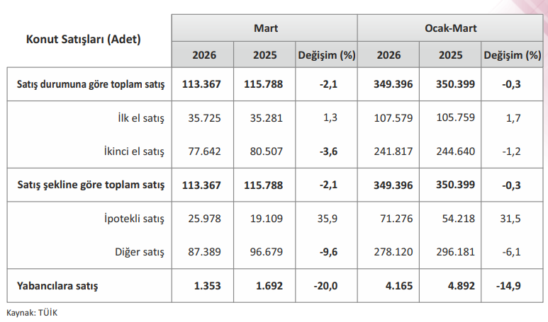 Türkiye genelinde ilk el konut satışları Mart ayında bir önceki yılın aynı ayına göre %1,3 oranında artarak