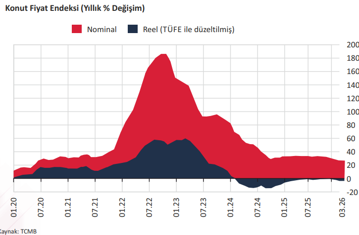 TCMB tarafından Türkiye’deki konutların kalite etkisinden arındırılmış fiyat değişimlerini izlemek amacıyla hesaplanan Konut Fiyat Endeksi (KFE) (2023=100), 2026 yılı Mart ayında bir önceki aya göre %2,0 oranında artarak 219,7 seviyesinde gerçekleşmiştir. Bir önceki yılın aynı ayına göre nominal olarak %26,4 oranında artan KFE, aynı dönemde reel olarak %3,4 oranında azalmıştır.