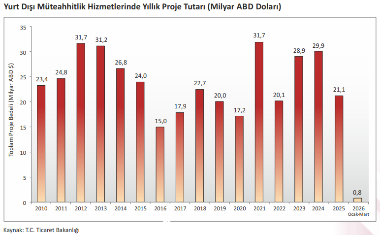 Ocak-Mart 2026 dönemi itibarıyla Türk inşaat sektörü tarafından yurt dışında 780,3 milyon ABD Doları tutarında 9 proje üstlenilmiştir. Böylece sektörün 1972 yılında Libya ile yurt dışı pazara açılmasından bu yana ulaştığı uluslararası proje portföyü büyüklüğü üstlenilen 12.852 projeyle toplam 559,6 milyar ABD Doları olmuştur. Yurt dışı müteahhitlik hizmetlerinin 2026 yılı ilk çeyrek dönemindeki performansı, savaşlar ve küresel jeopolitik gerilimlerin de etkisiyle zayıf kalmıştır.