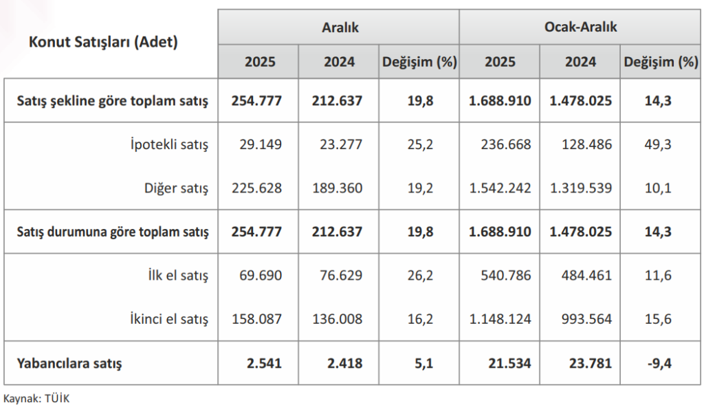 Türkiye genelinde konut satışları 2025 yılı Aralık ayında bir önceki yılın aynı ayına göre %19,8 oranında
