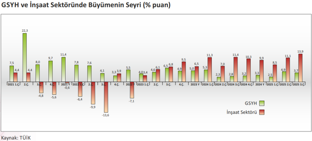 Türkiye ekonomisi 2025 yılı üçüncü çeyreğinde çeyreklik bazda %1,1, yıllık bazda %3,7 oranında büyümüştür. İnşaat sektörü %13,9 ile yılın üçüncü çeyreğinde genel ekonominin önünde bir büyüme