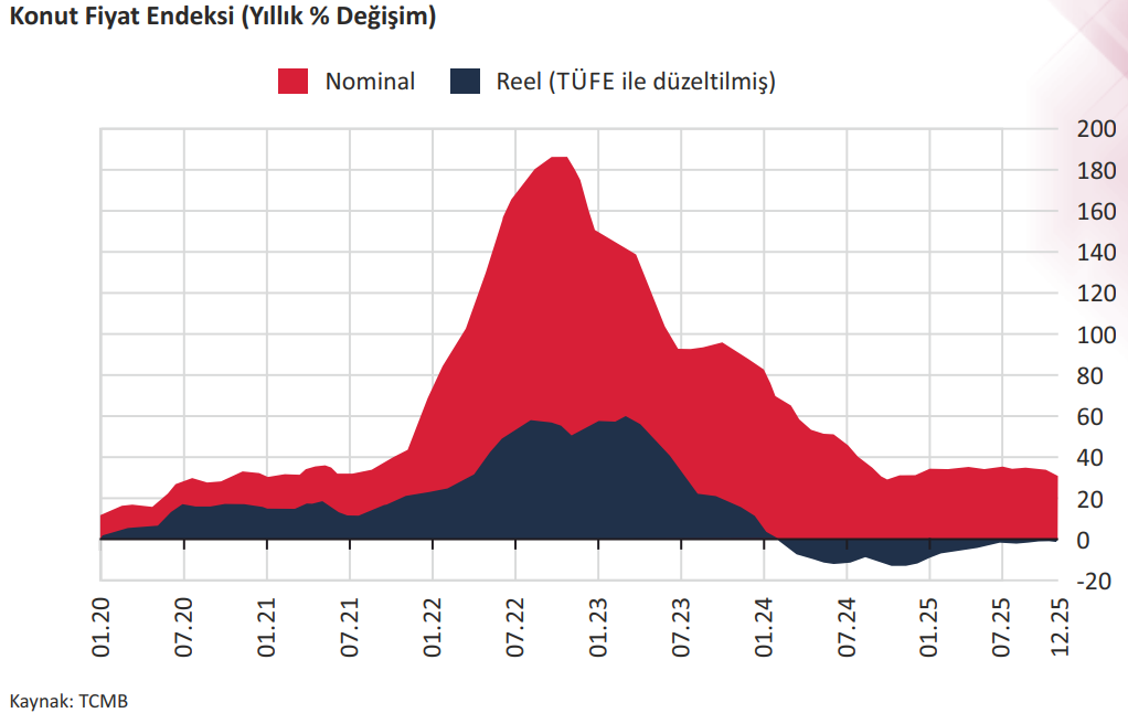 %29,0 oranında artan KFE, aynı dönemde reel olarak %1,4 oranında azalmıştır. 2025 yılı Aralık ayında şehirlere göre konut fiyat endekslerindeki gelişmeler değerlendirildiğinde aylık bazda İstanbul’da %0,2,