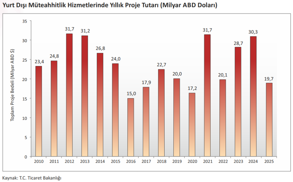 Ocak-Aralık 2025 dönemi itibarıyla Türk inşaat sektörü tarafından yurt dışında 19,7 milyar ABD Doları