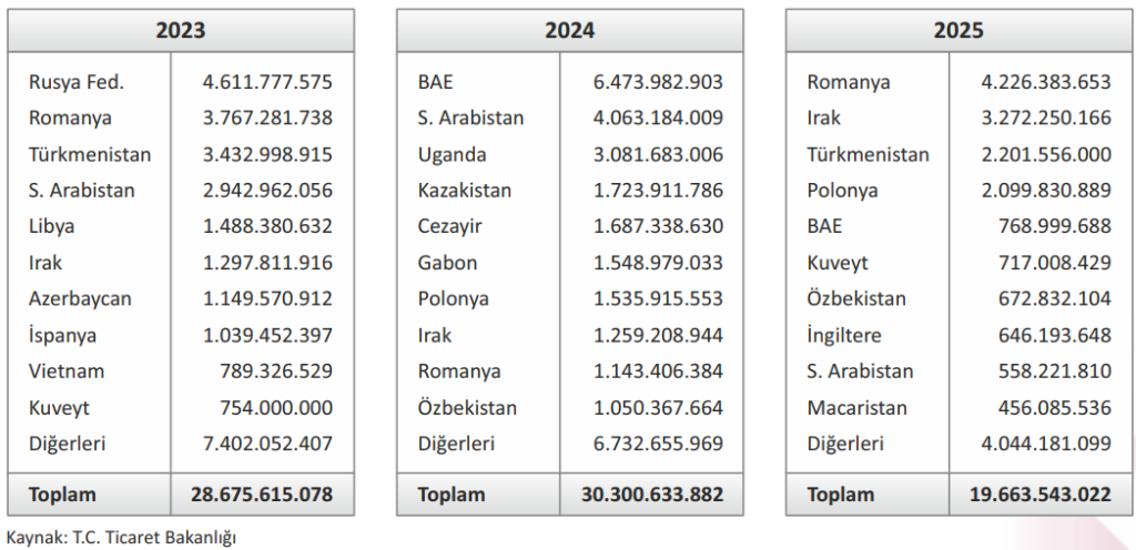 2025 yılında yurt dışında en çok iş üstlenilen ülke 4,2 milyar ABD Doları ile Romanya olurken, 3,3 milyar