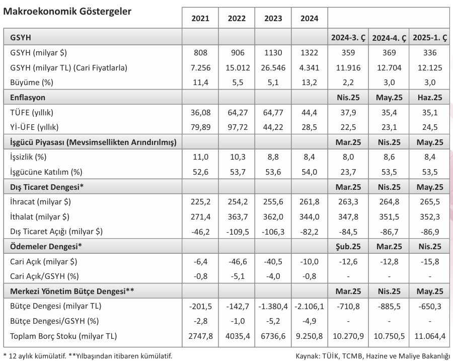 Türkiye ekonomisi, TÜİK’in zincirlenmiş hacim endeksine göre 2025 yılının ilk çeyreğinde geçen yılın aynı çeyreğine göre beklentilerin altında kalarak %2,0 büyümüştür. Böylece, Türkiye ekonomisi pandemi önlemlerinin etkili olduğu 2020 yılının ikinci çeyreğinden bu yana yıllık bazda en zayıf büyüme performansını sergilemiştir. Gayrisafi Yurt İçi Hasıla (GSYH) büyüklüğü 2025 yılının ilk çeyreğinde cari fiyatlarla bir önceki yılın aynı çeyreğine göre %36,7 artarak 12 trilyon 125 milyar 173 milyon Türk Lirası olmuştur. GSYH’nin birinci çeyrek değeri cari fiyatlarla ABD Doları bazında 335 milyar 504 milyon olarak