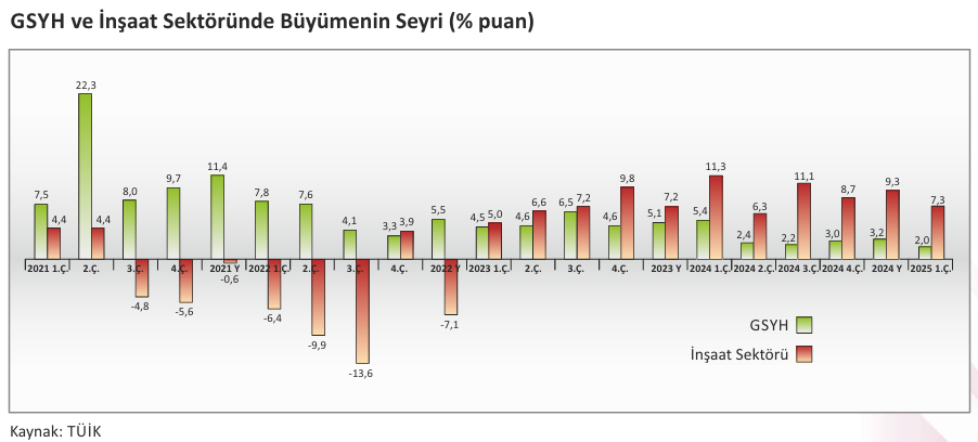 Bu koşullar altında 2025 yılı ilk çeyreğini tamamlayan inşaat sektörü, %7,3 ile genel ekonominin üzerinde bir büyüme kaydetmiştir. Böylece sektör, ivme kaybetmesine rağmen deprem bölgesinin yeniden imarı ve büyükşehirlerde devam eden kentsel dönüşüm çalışmalarının da etkisiyle üst üste 10 çeyrek kesintisiz büyümeye devam etmiştir.