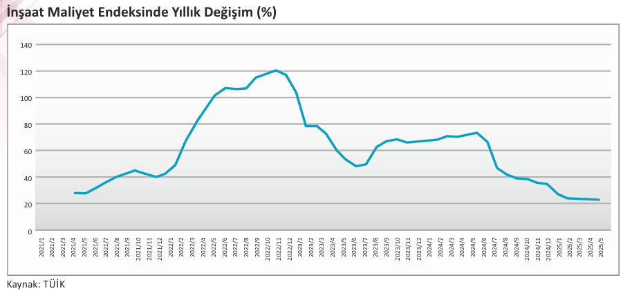 TÜİK tarafından açıklanan İnşaat Maliyet Endeksi verilerine göre malzeme ve işçilik maliyetlerindeki artış yavaşlamaya devam etmiştir. Endeks, Mayıs ayında aylık bazda %0,88, yıllık bazda ise %22,40 oranında artmıştır. Böylece Kasım 2020’den bu yana en düşük yıllık artış görülmüştür. İnşaat Maliyet Endeksi kapsamındaki malzeme endeksi Mayıs’ta aylık bazda %1,09 ve yıllık bazda %17,81 artarken; işçilik endeksi aylık bazda %0,52, yıllık bazda ise %31,9 yükselmiştir.