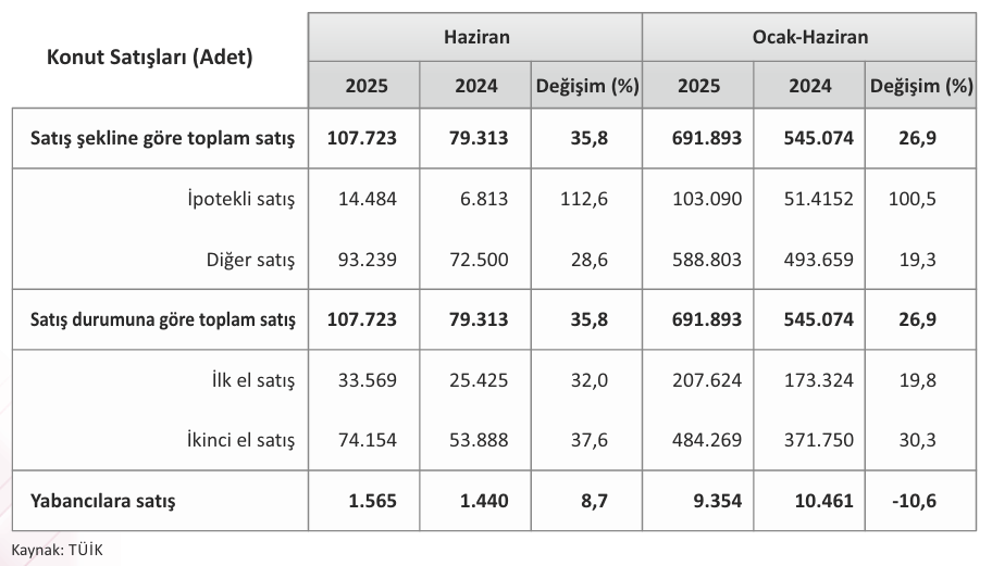 Türkiye genelinde konut satışları 2025 yılı Haziran ayında bir önceki yılın aynı ayına göre %35,8 oranında artarak 107 bin 723 olmuştur. 2025 yılı Ocak-Haziran döneminde ise bir önceki yılın aynı dönemine göre %26,9 artan konut satışları 691 bin 893 olarak gerçekleşmiştir.